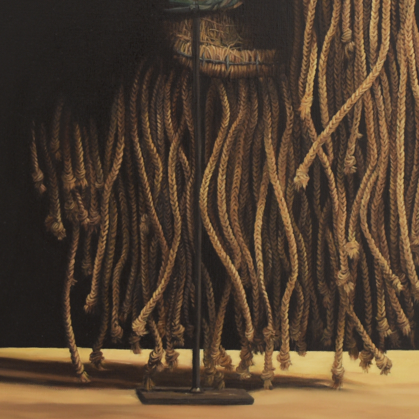 Pwo is one the most popular dancing masks among the Chokwe. Because they follow matrilineal descent, the Chokwe dance pwo to honor the founding female ancestor of the lineage. A male dancer is dressed like a woman in a costume of braided fiber that completely covers his body and hides his identity. He wears a loincloth, carries a fan and moves in slow, precise steps to emulate a woman.