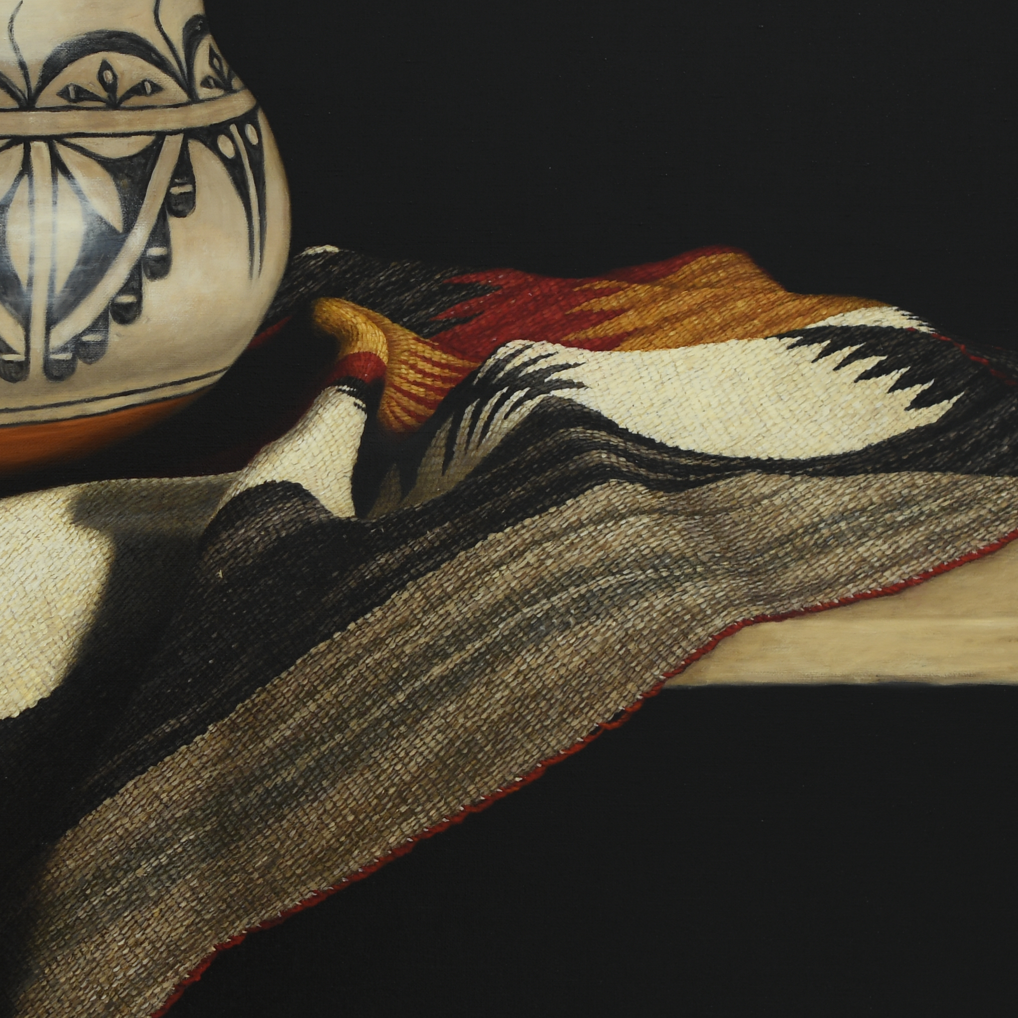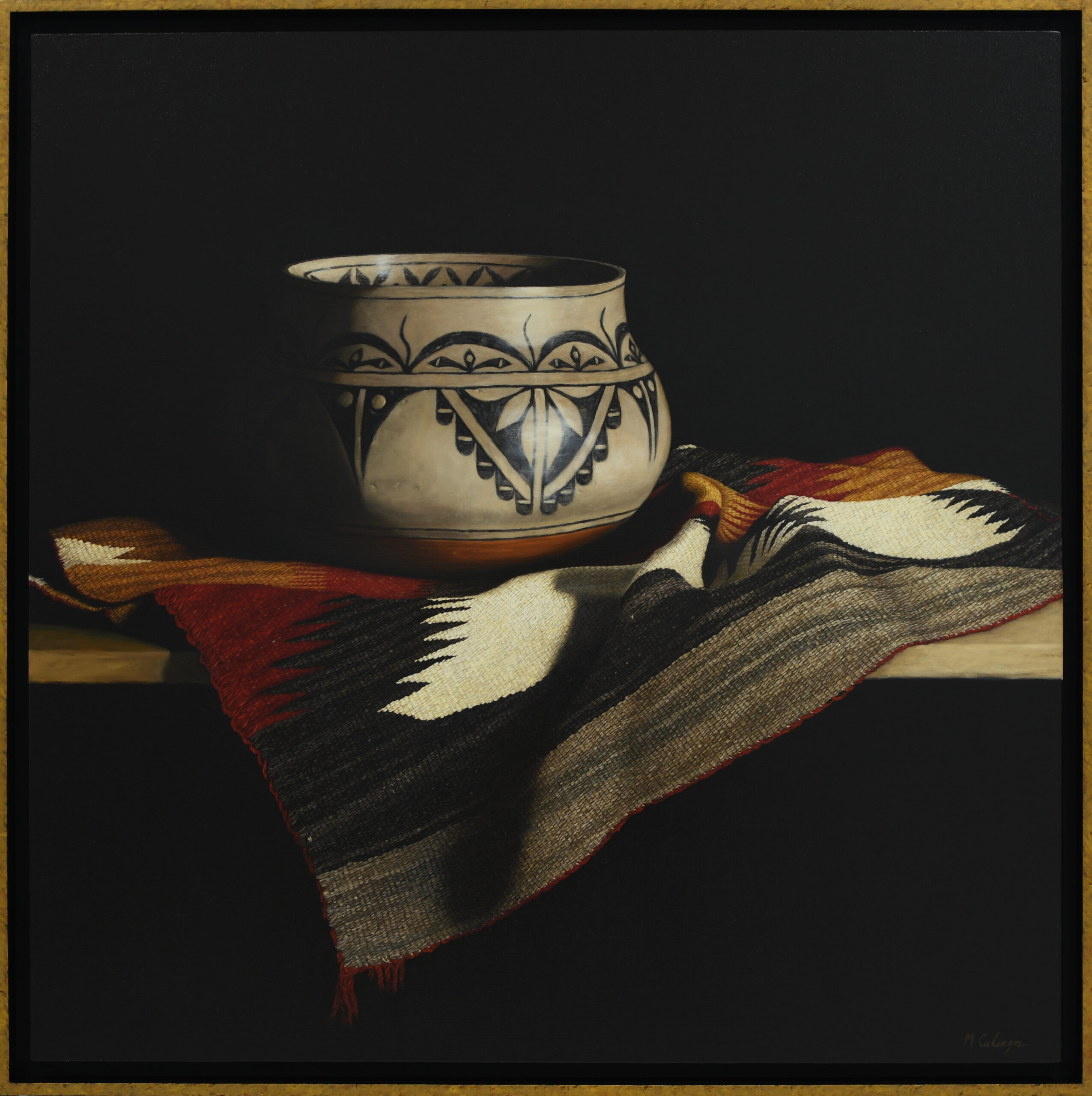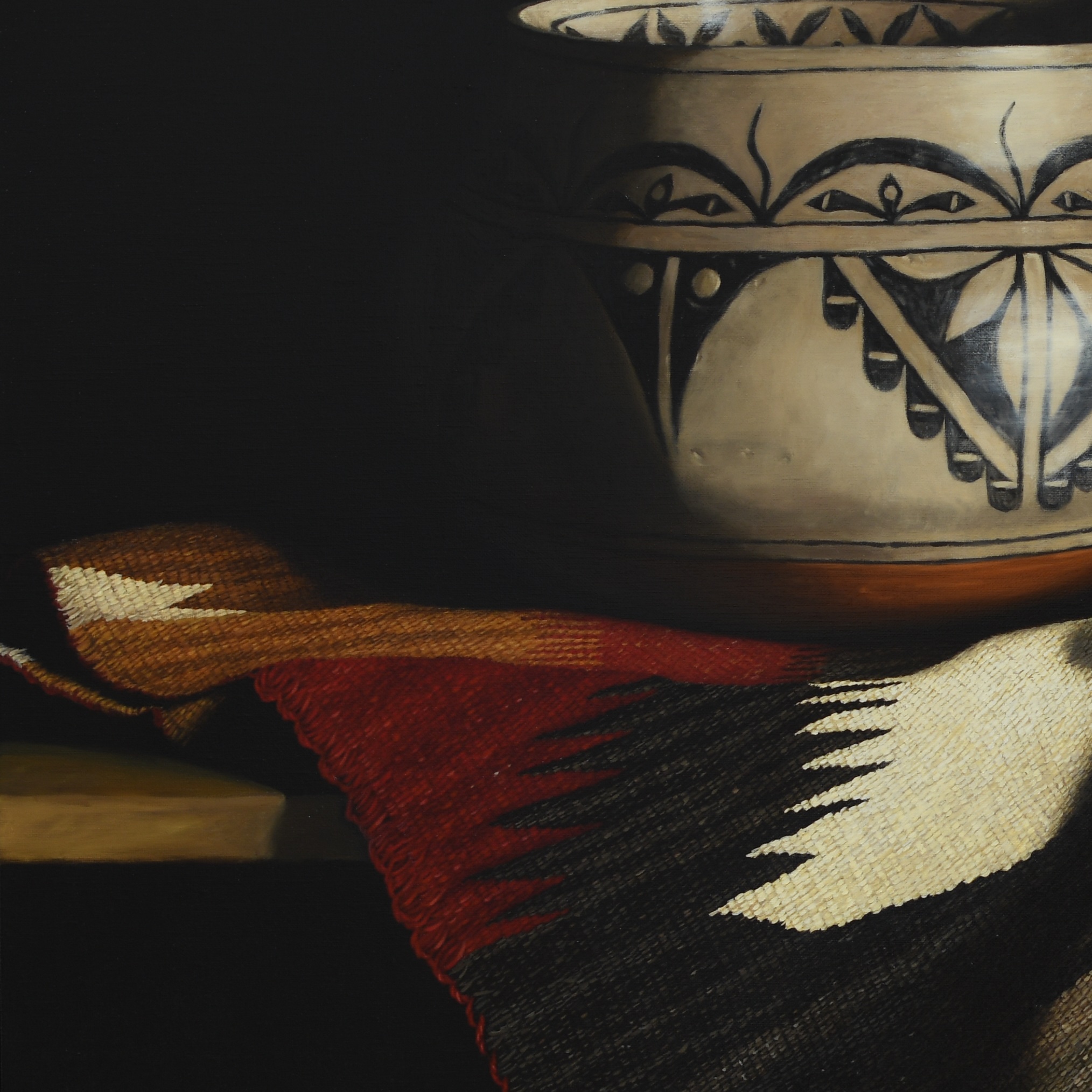 While visiting Santa Fe, I had the great pleasure of meeting Ricardo and Victoria Ortiz from the San Felipe Pueblo. I was walking through the Indian Market and was stopped in my tracks when my eye caught this pot. I immediately engaged the Ortizes about its creation. They were wonderful people to talk to, so passionate about their art and culture. They told me all about their process and the clay, referred to as Mother Earth, which is all natural and locally sourced from San Felipe land. Victoria’s role was to process the raw clay, which involves grinding it into a powder using stones before mixing it with water and volcanic ash, which prevents cracking. Ricardo then creates the pottery. He is very committed to preservation, tradition, and the spiritual connection between the potter and the earth, viewing pottery as a “reborn” part of the ground. The designs painted on the pottery are very traditional, symbolic of clouds, lightning, and Kiva steps, reflecting prayers for rain. This pot also has “prayer feathers” along the inside of the rim. It meant a lot to me to meet and connect with Ricardo and Victoria, and I feel very honored to have such a sacred and meaningful piece of their work in my home. So much so, that I wanted it to be showcased in this painting, San Felipe Clay.