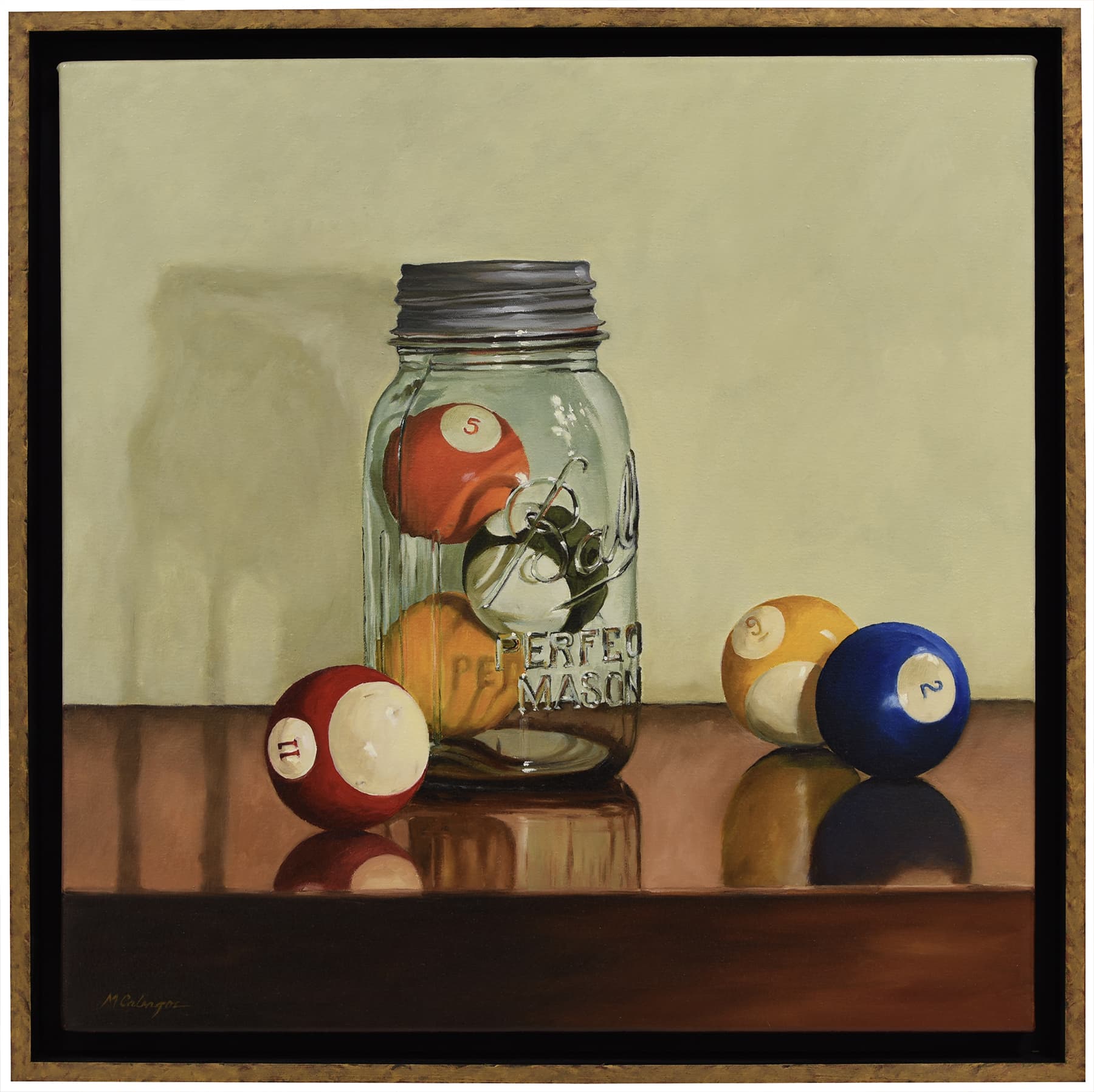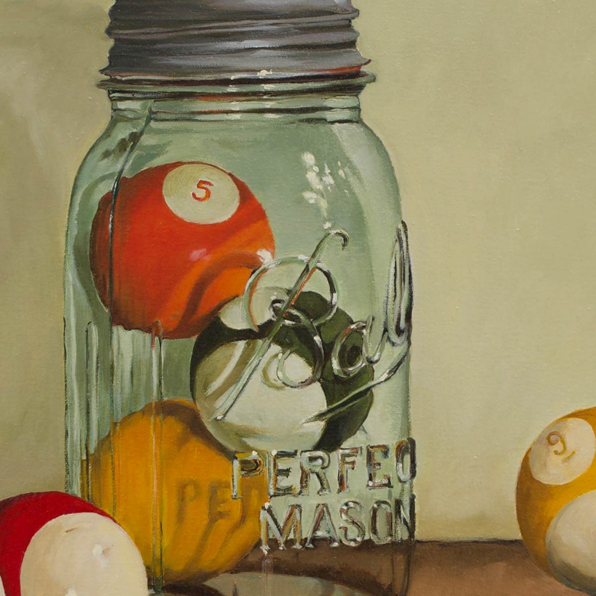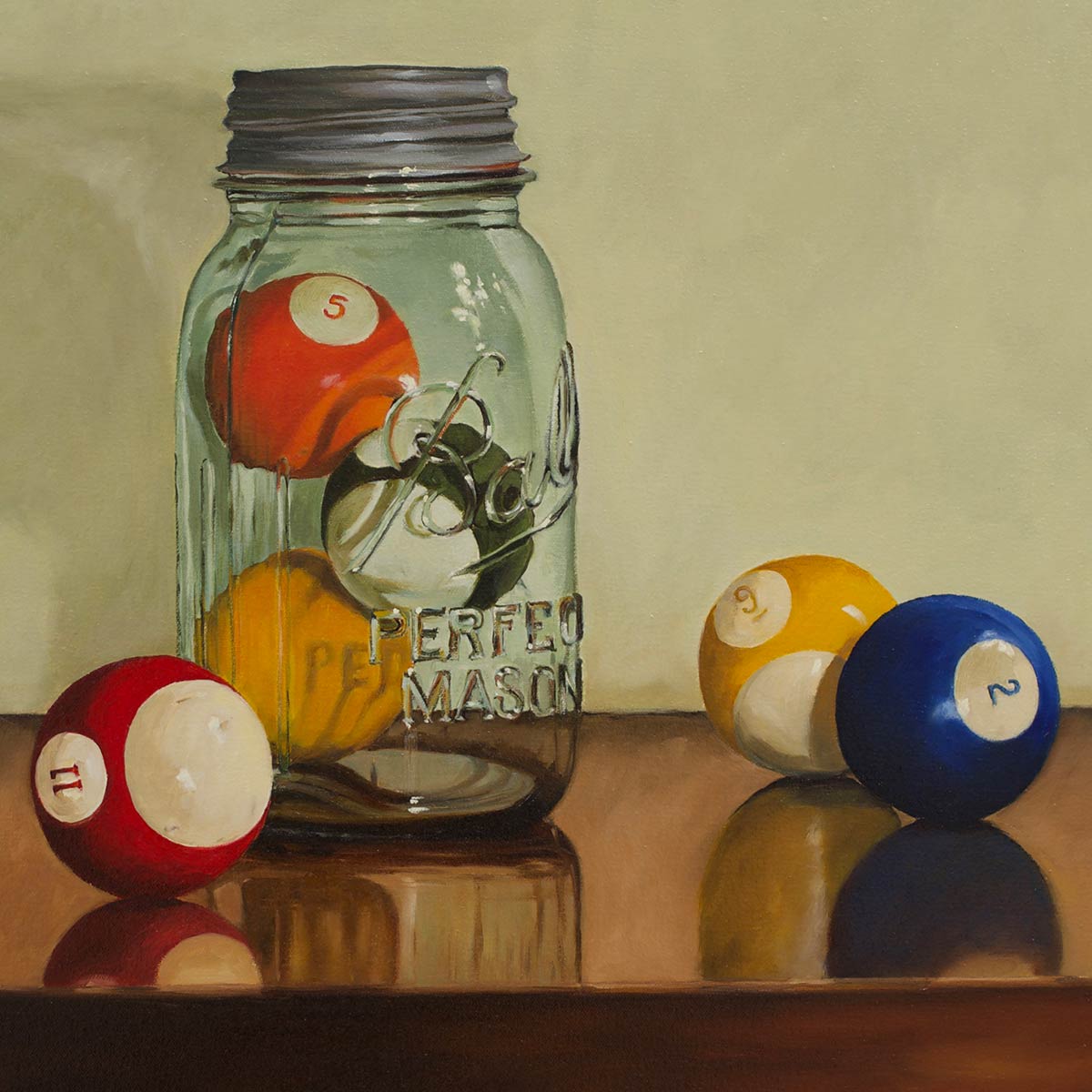 I stopped at an antique store in Frontenac, Minnesota located along Highway 61 and the Mississippi River. It is a drive I make on a regular basis and one day I took the time to stop. These old billiard balls caught my eye as I was halfway out the door. They were hidden on a low shelf, in a plastic bag and a bowl. Call it fate that I saw a bit of faint color coming through the bag and went back in. I had this antique Ball mason jar, the perfect vessel to hold the new subject matter, hence the name for this painting.